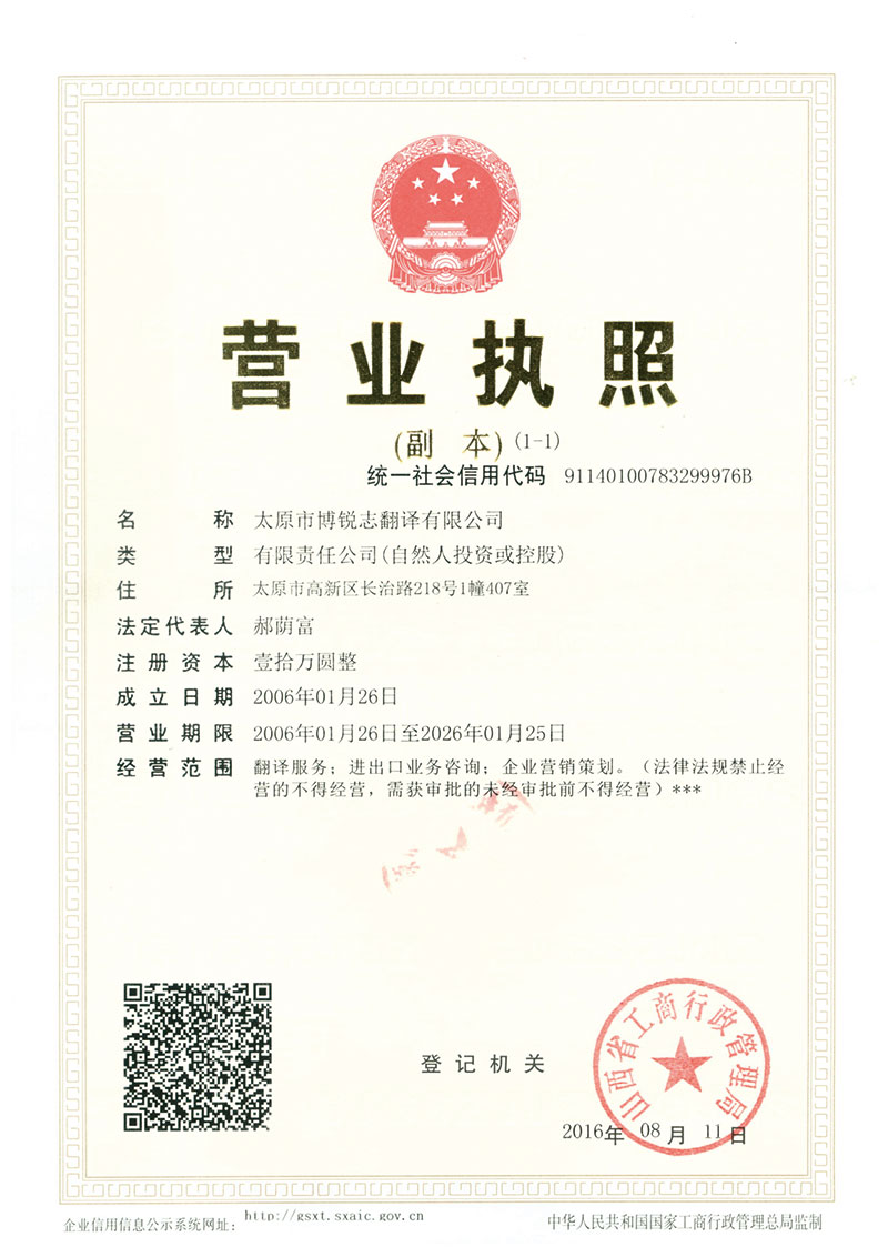 太原市博銳志翻譯有限公司留英市場營銷碩士郝宇云先生于2006年創(chuàng)辦,公司名稱由英文單詞Bridge音譯而來,正如其意,太原市博銳志公司就是要以專業(yè)的知識、誠心誠意的服務(wù)態(tài)度為客戶打造一座跨越語言障礙的橋梁,并提供切實可行的解決方案。博銳志翻譯公司服務(wù)內(nèi)容涵蓋各類證件翻譯、各種外語文書翻譯、網(wǎng)站頁面翻譯、市場調(diào)研、海外企業(yè)信用調(diào)查、企業(yè)市場營銷戰(zhàn)略咨詢、市場營銷項目策劃等。為回報社會,由股東出資10000元人民幣創(chuàng)立蔭富助學(xué)基金,并將公司年收入的1%作為此基金的補充來幫助那些學(xué)習****但家境貧困的學(xué)生。